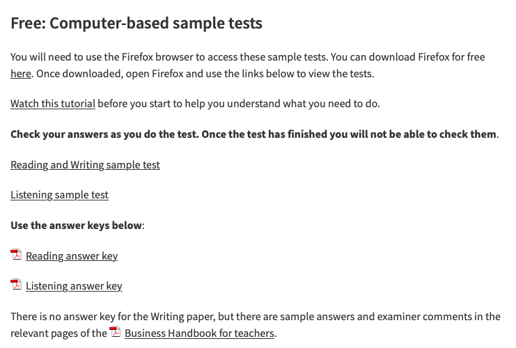 5) Your last activity is opening the link below and reading through the information on the BEC exam. For those doing the First please go on-line to the Cambridge site and check out the information. I would like those doing the BEC to do the COMPUTER based listening. You need to click on the link and scroll down the open 'Exam and test practice.' Do the listening and let me know your score out of 30 when you self-correct. This is where you can find it.